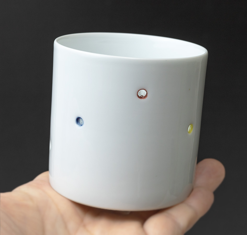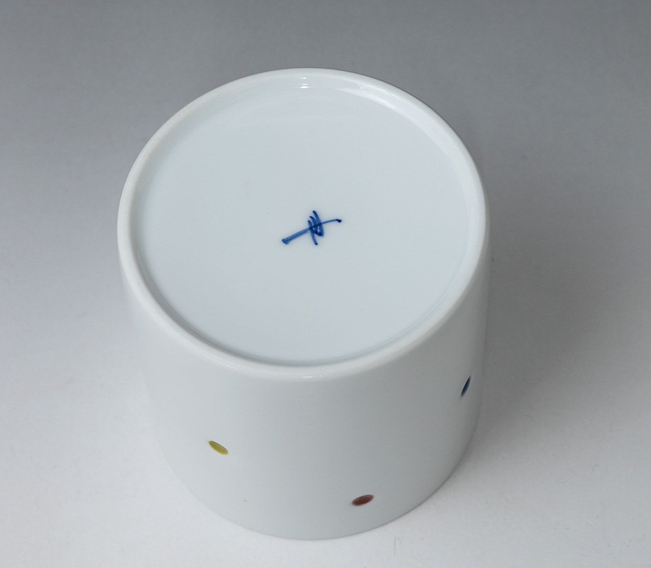 A very unique cup from Hasami, Nagasaki prefecture. The small holes are punched out, colored and then filled in with "secret crystal",