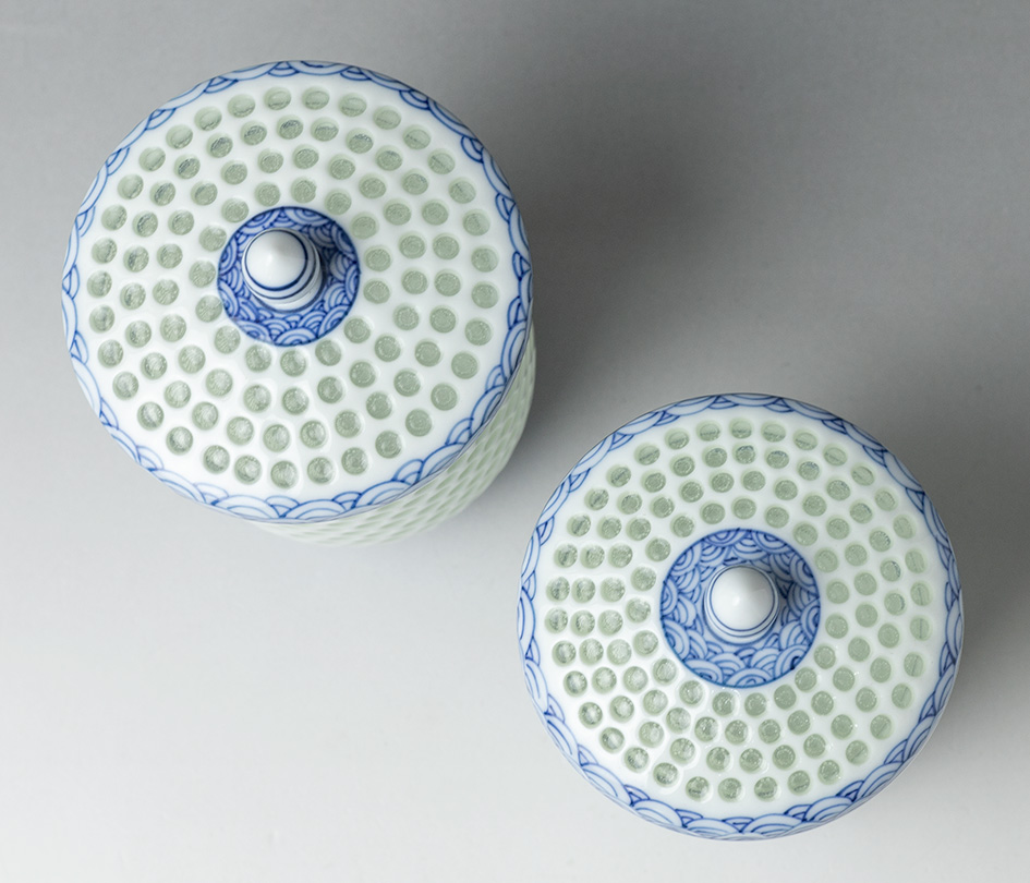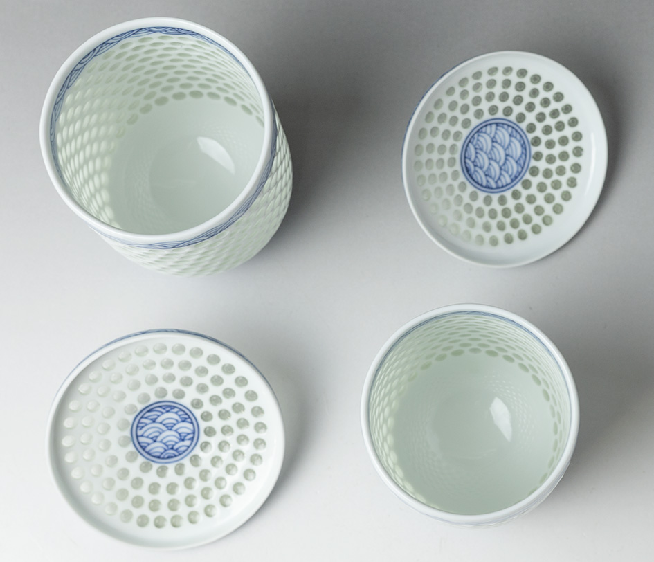 adding a lovely translucent quality to the white porcelain which is further offset by bands of sometsuke wave patterns.