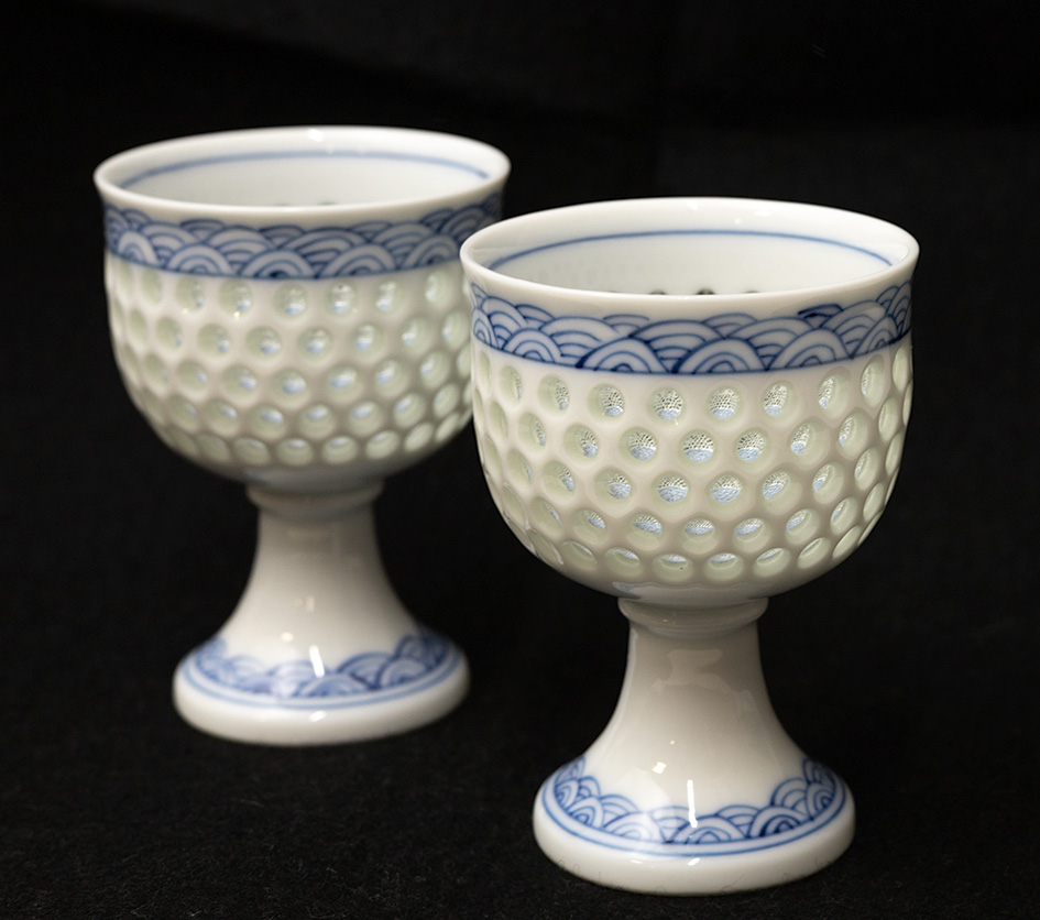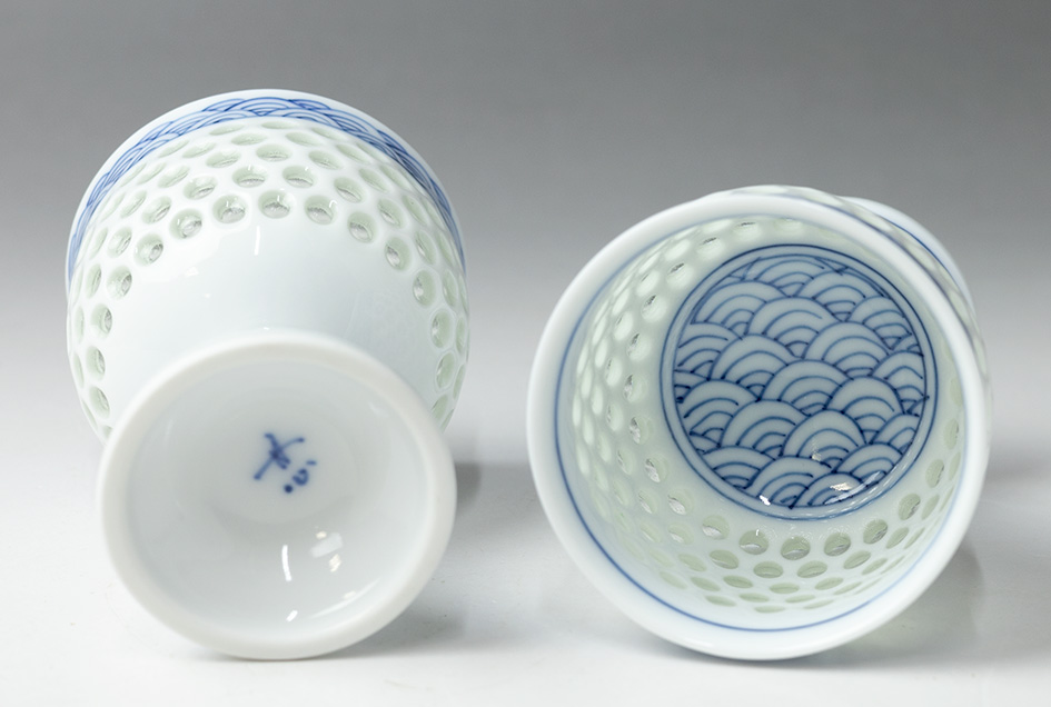 A very unique cup from Hasami, Nagasaki prefecture. The small holes around the sides are individually punched out by hand to create a lacy pattern and then filled in with "secret crystal", a material whose exact properties are known only to the craftsmen of the kiln! When held up to the light, the holes sparkle, adding a lovely translucent quality to the white porcelain which is further offset by bands of sometsuke wave patterns. Exquisite craftsmanship!