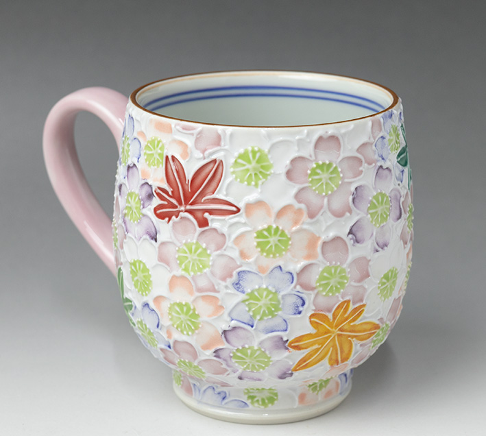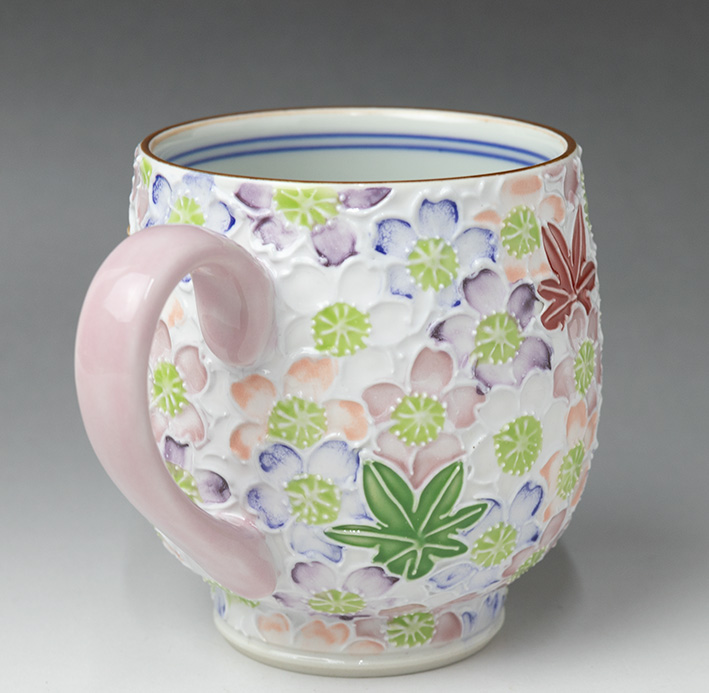 Hand-decorated with the Icchin slip-trailing technique, this mug features a traditional raised Unkin design of cherry blossom and maple leaves.