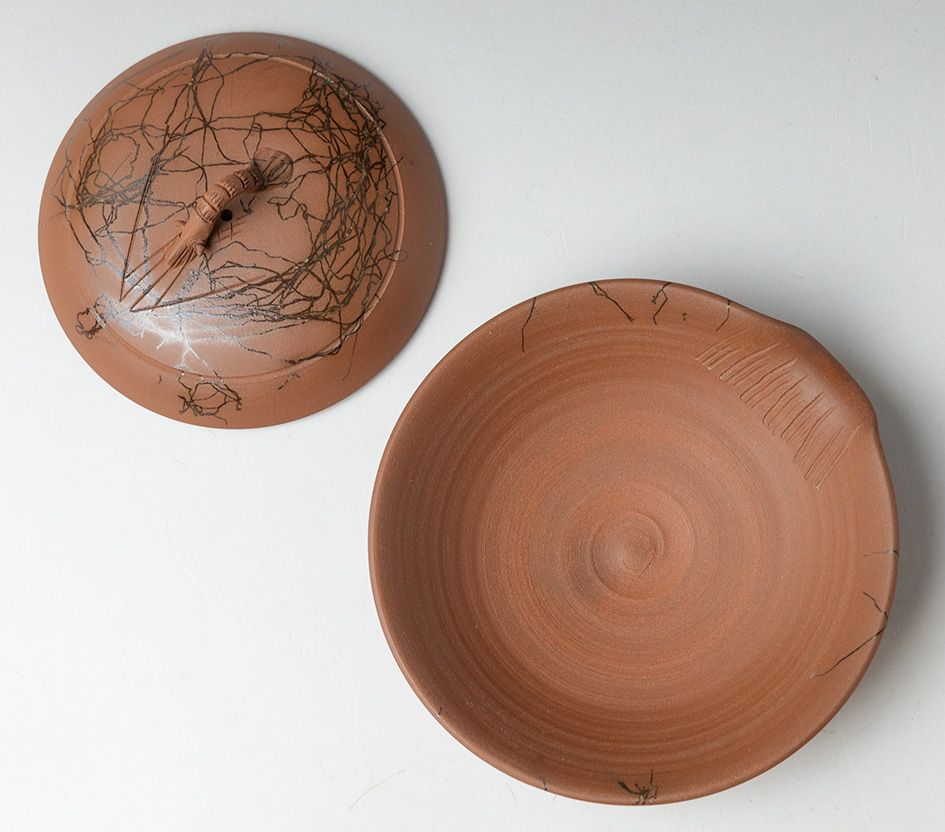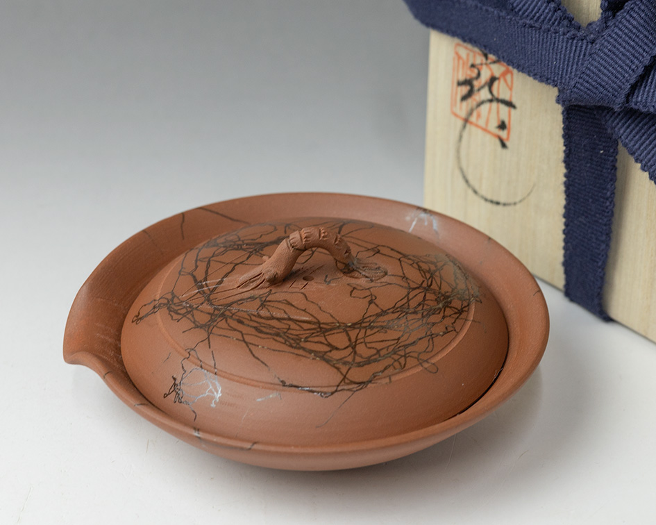 The knob is in the shape of an algae shrimp. Mogake is a traditional technique consisting of applying seaweed on unglazed teapots before firing.