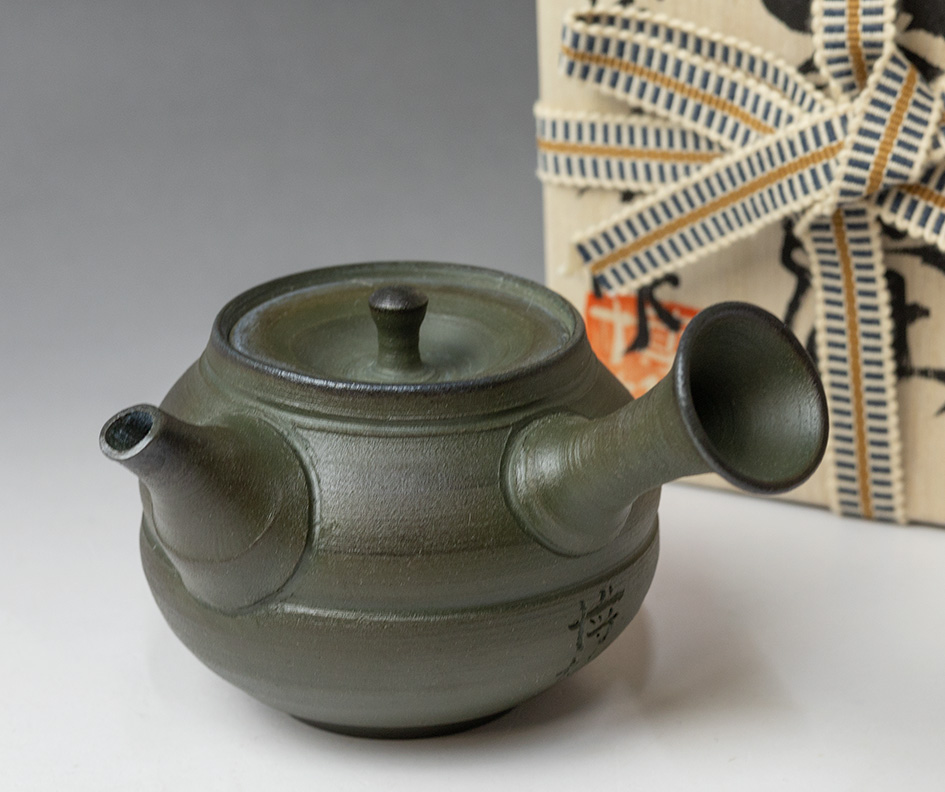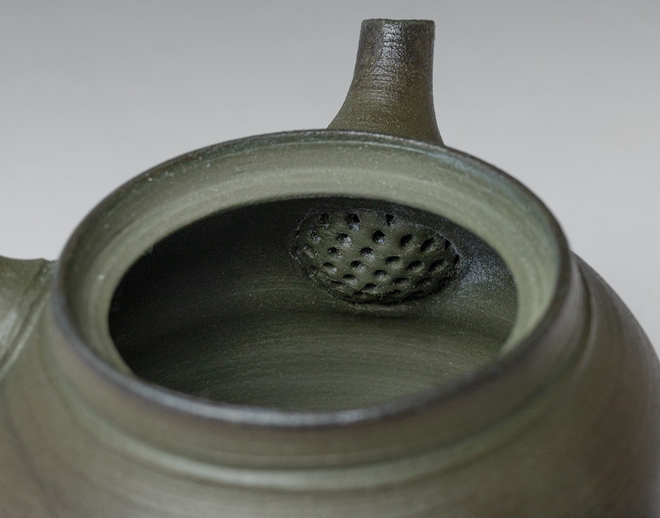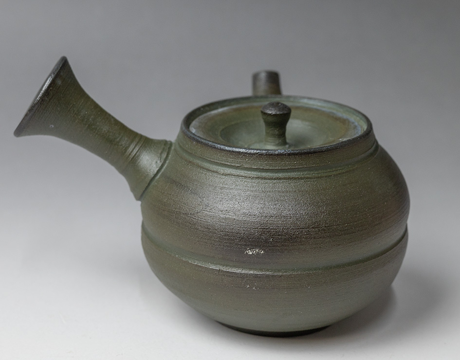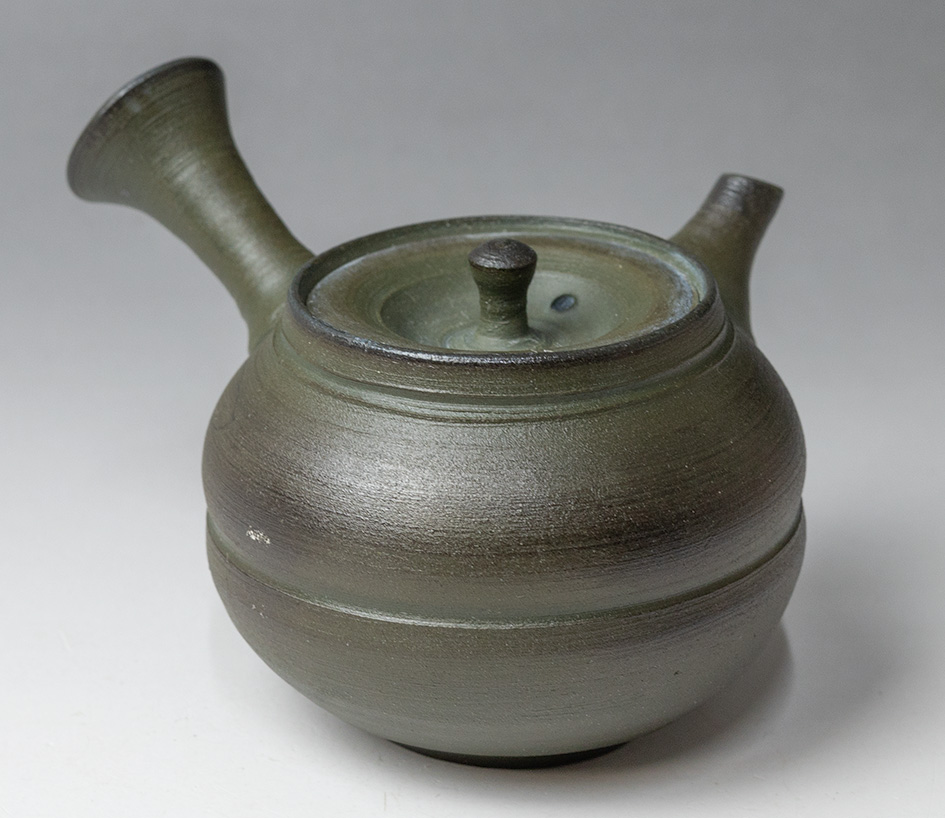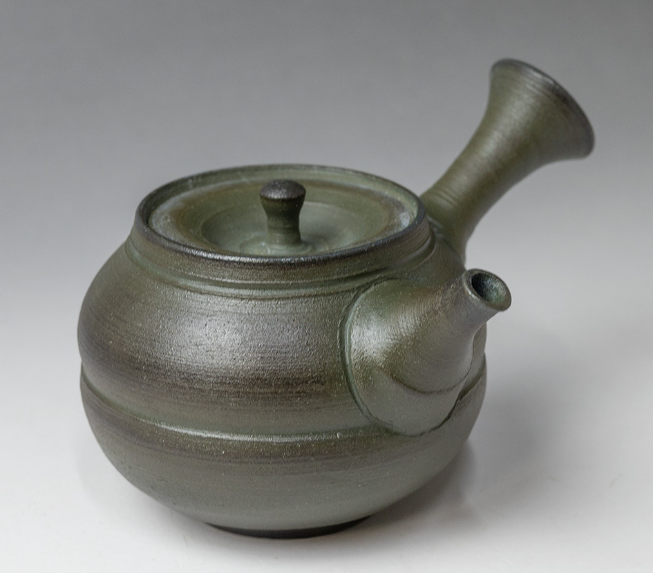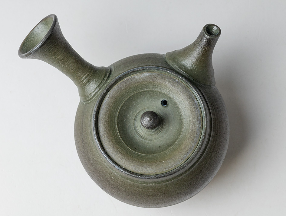 This kyusu is a deep olive green with a burnished yohen finish. There is a trace of ash on the body, left over from firing.