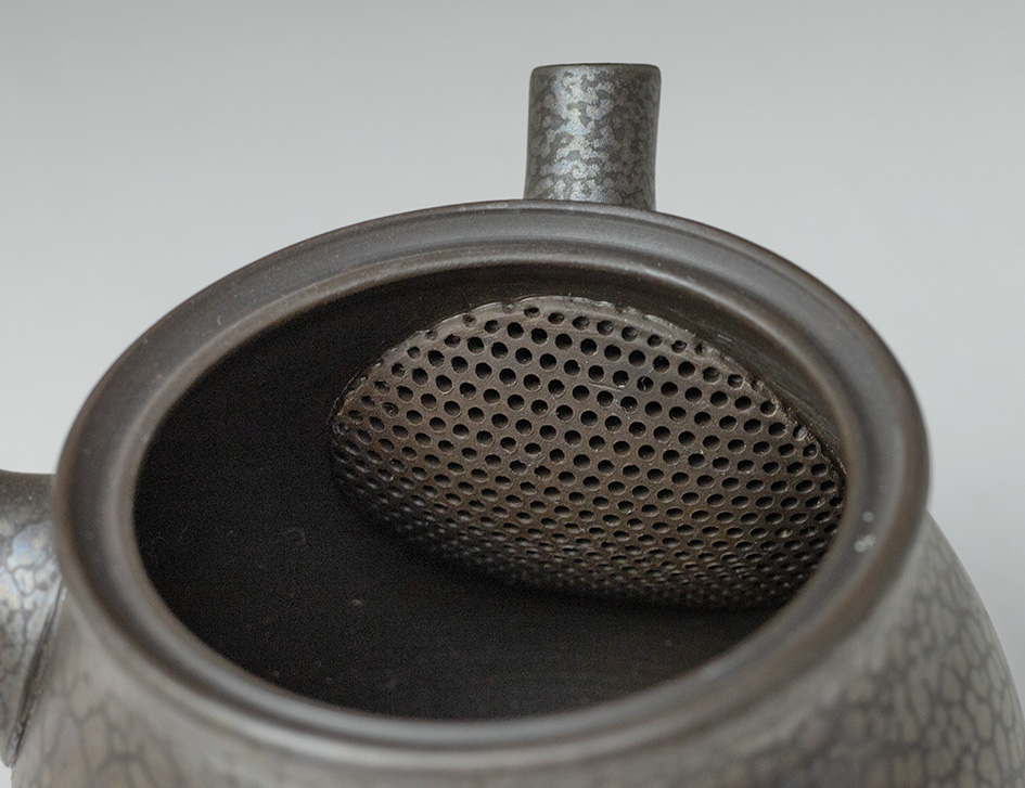 The tenmoku (oil droplet) design on this teapot bears witness to Shoryu’s technique and creativity. The tenmoku design usually needs a thick glaze,